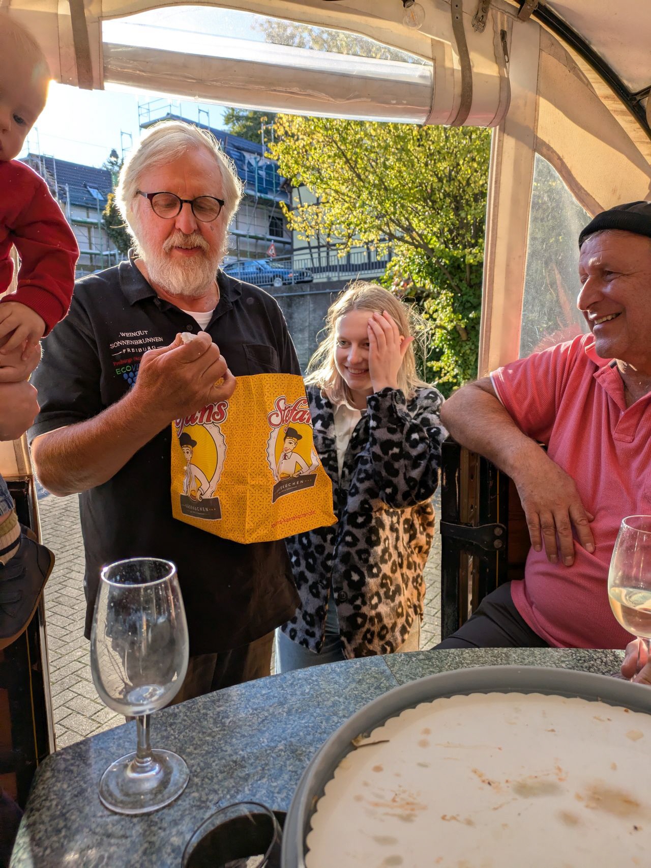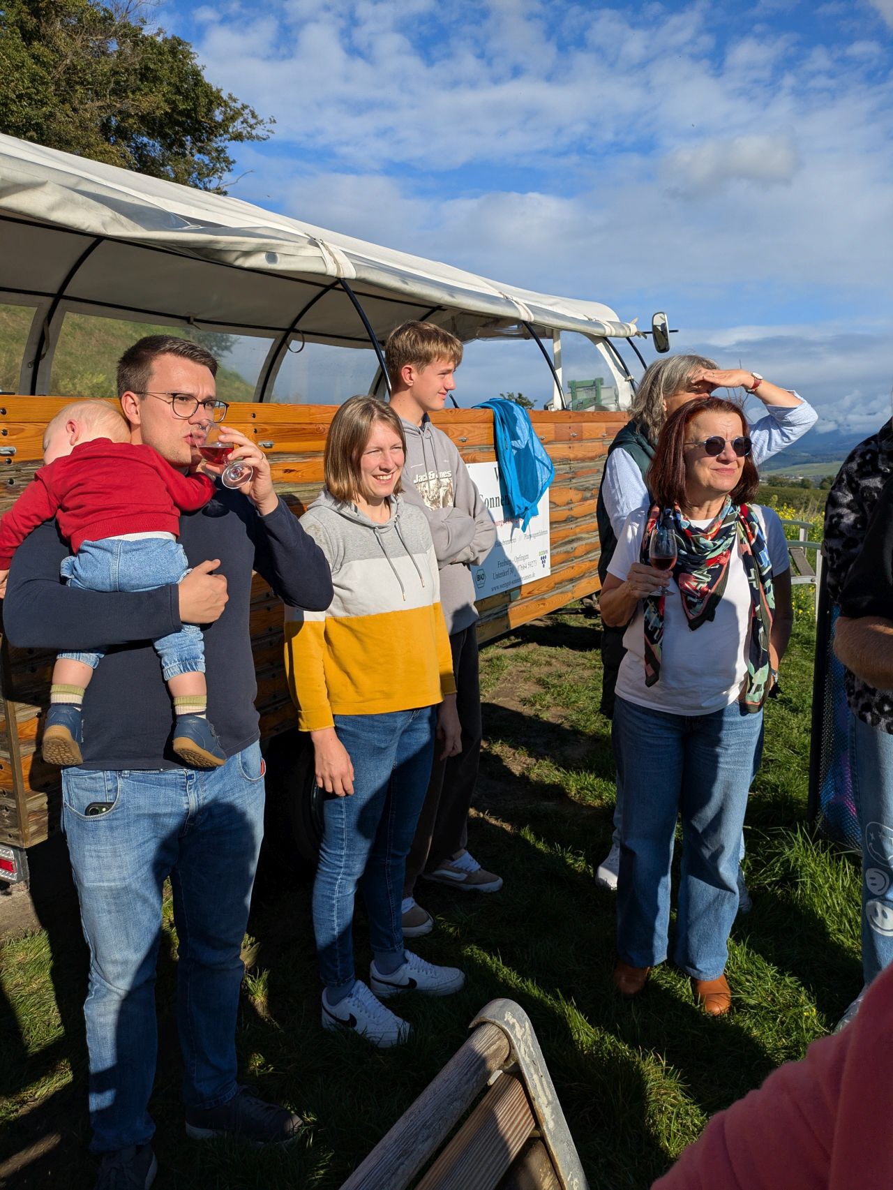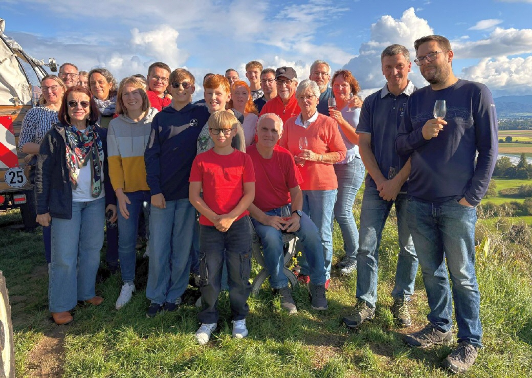 Am nächsten Tag ging es hinaus ins Grüne: Vom Bioweingut „Sonnenbrunnen“ in Opfingen startete eine gemütliche Planwagenfahrt mit Weinverkostung in die Weinberge vom Tuniberg. Bei herrlicher Aussicht über die Vogesen, die Rheinebene, Freiburg und den Schwarzwald ließen sich die Musikerinnen und Musiker edle Tropfen schmecken und die Landschaft genießen.