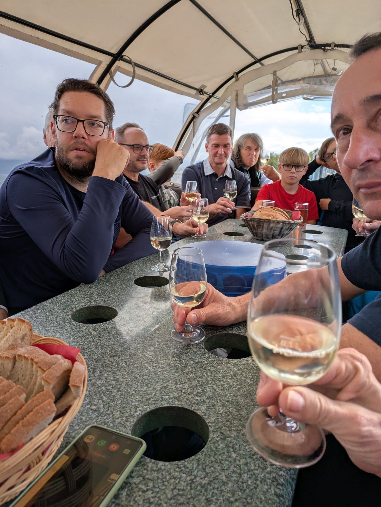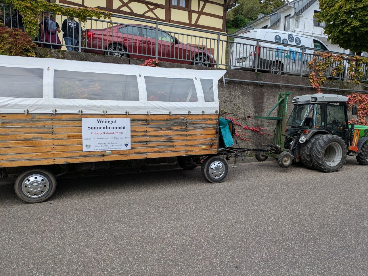 Am nächsten Tag ging es hinaus ins Grüne: Vom Bioweingut „Sonnenbrunnen“ in Opfingen startete eine gemütliche Planwagenfahrt mit Weinverkostung in die Weinberge vom Tuniberg. Bei herrlicher Aussicht über die Vogesen, die Rheinebene, Freiburg und den Schwarzwald ließen sich die Musikerinnen und Musiker edle Tropfen schmecken und die Landschaft genießen.